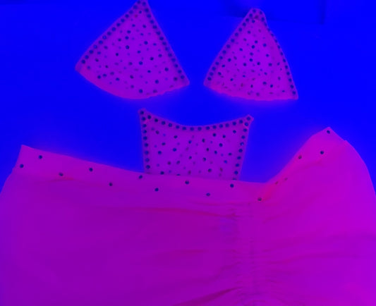 GLOW Black Light Hot Pink mesh Rhinestone Designer Set - Clear Elastic MICRO illusion bikini from AA to DD cups