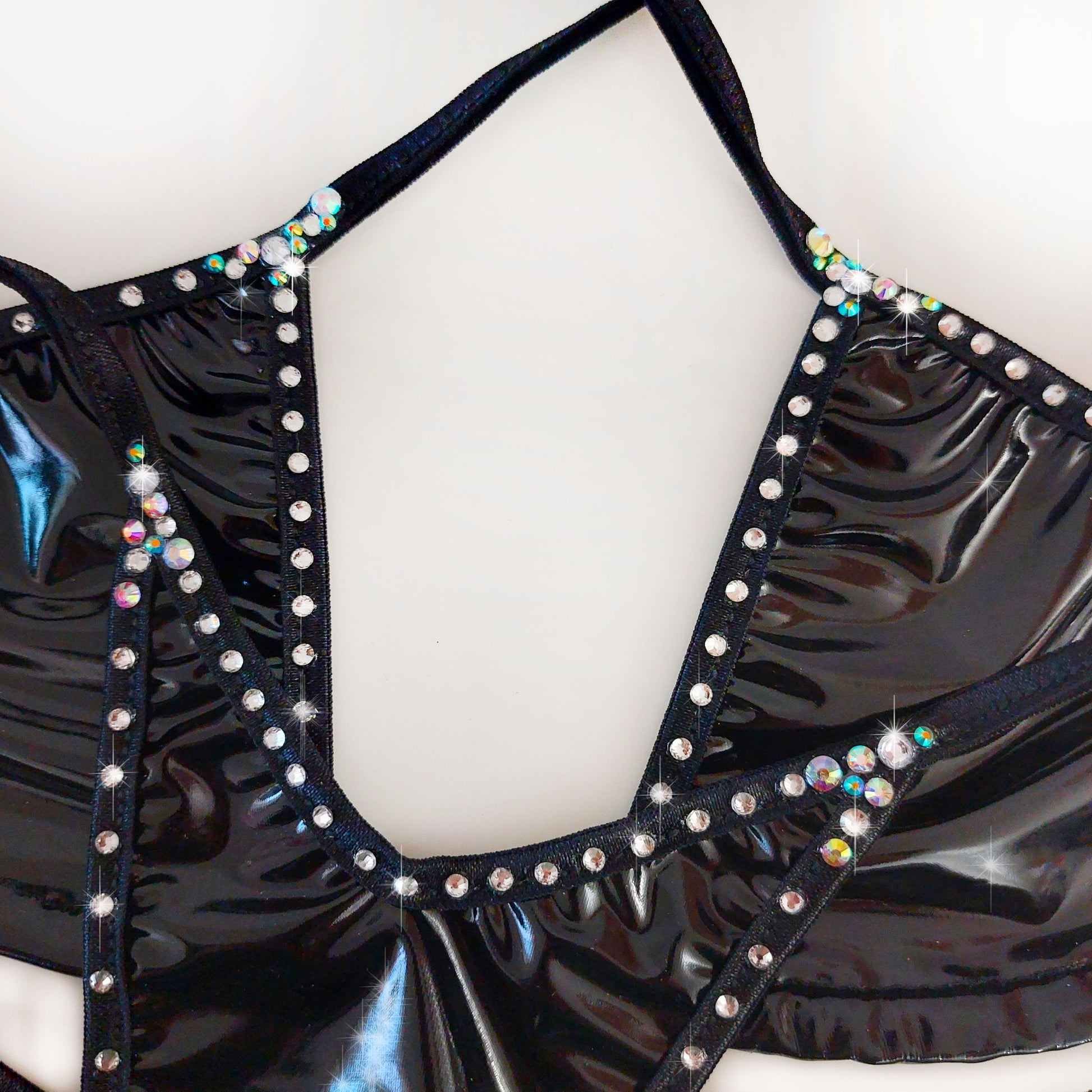 Glam wet look vinyl outlined with hand applied diamond crystal rhinestones. 6 colors. We offer Mix & Match sizing from AA to DD and bottom sizes XS to LG. Quality 4 way stretch vinyl PVS fabric and hand-applied rhinestones. Built for the hustle, this will hold up at work or at the rave.