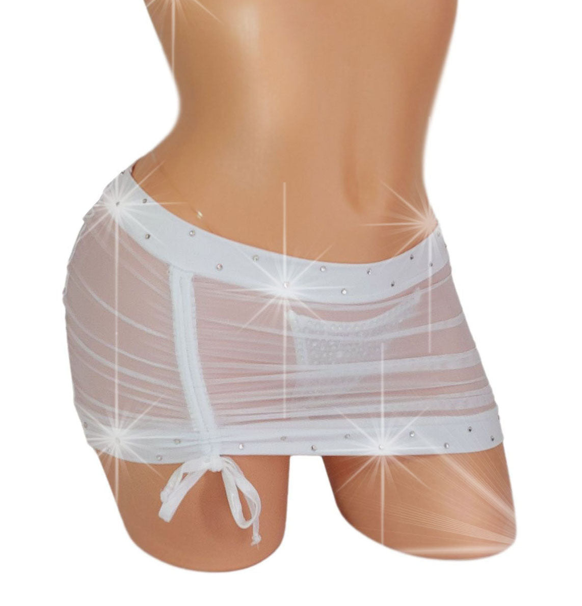 Invisible Micro Bikini in Red lycra with Red Mesh mini skirt! Adjustable skirt length in front. Ruffle gathers in the rear. This stunning set features our signature Illusion clear elastic that you knot yourself wherever you want it for perfect fit. Covered in hand applied crystal rhinestones, adding a ton of sparkle. From AA cup to DD cup tops and XS to LG bottoms. Bikini set is lycra spandex, skirt is stretch mesh. Rhinestones are applied by hand and will not fall off, rub off, wash off.